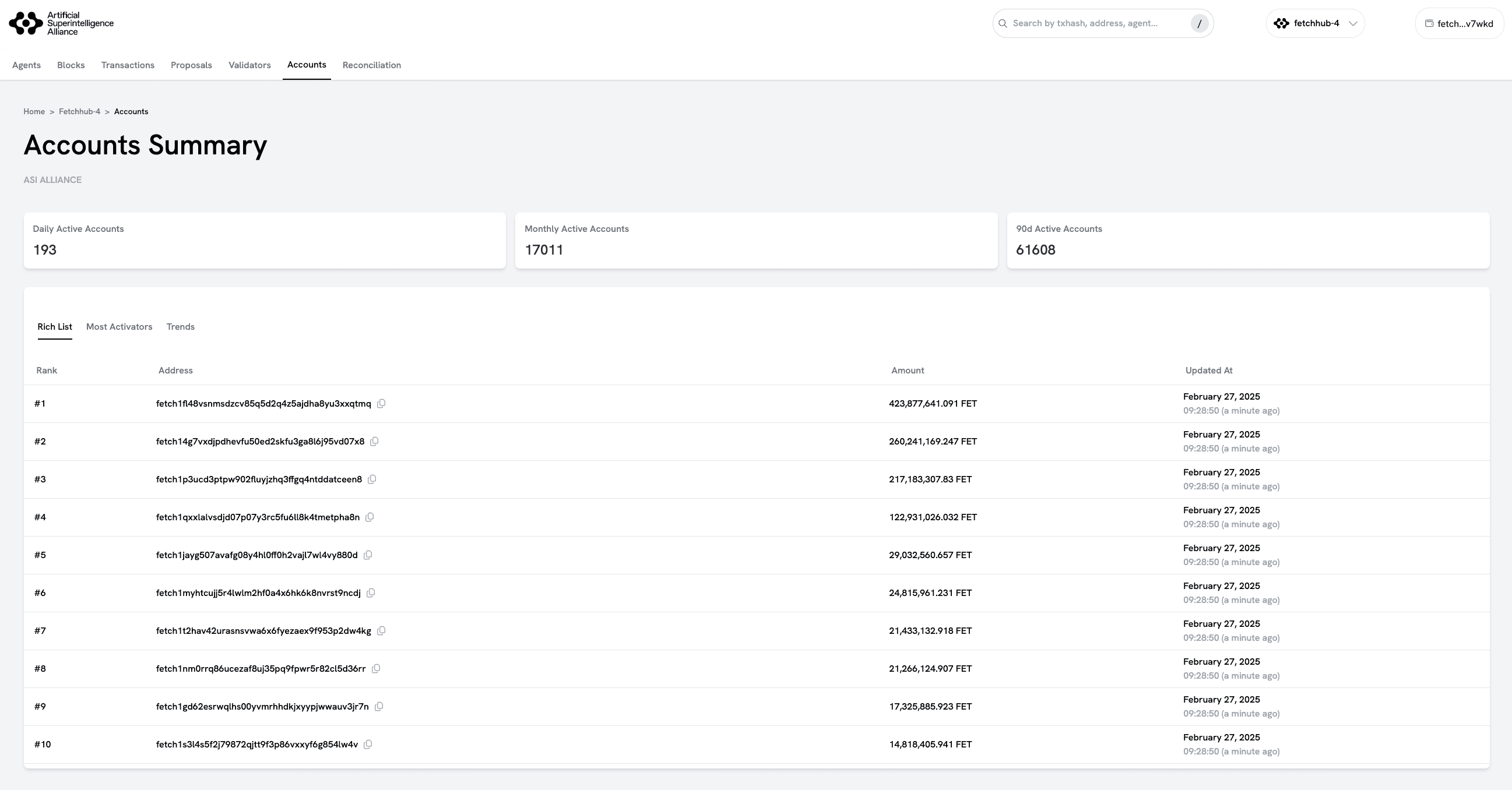 You can choose among multiple options to explore Accounts: Rich List, Most Activators and Trends. Within the Rich List option, you can view the top accounts ranked by their FET holdings with the multiple details, including the Accounts Address and amounts of FET being held by each account.