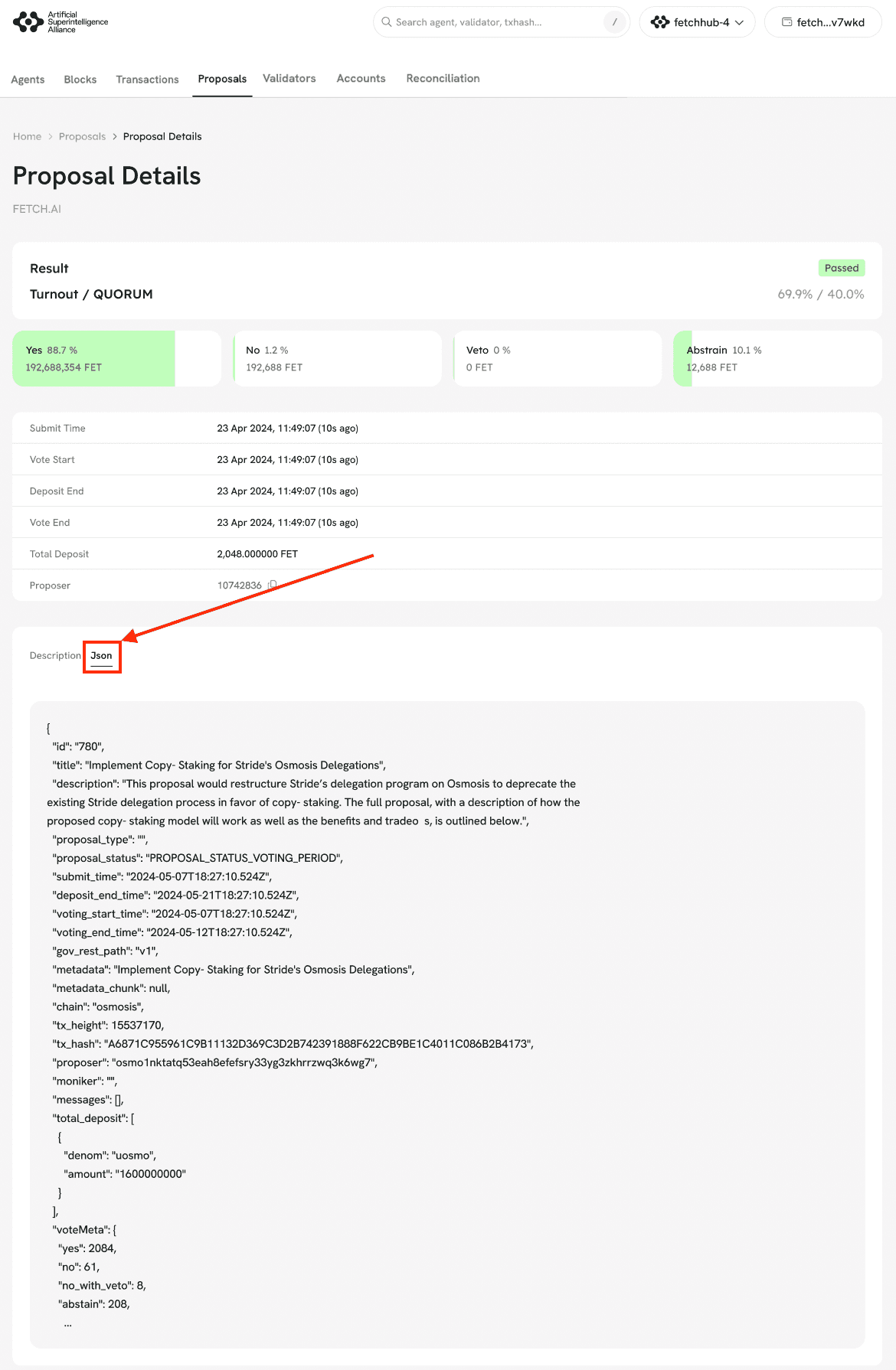 Instead, by clicking on the Json tab, you will be able to explore the Proposal’s details in json format: