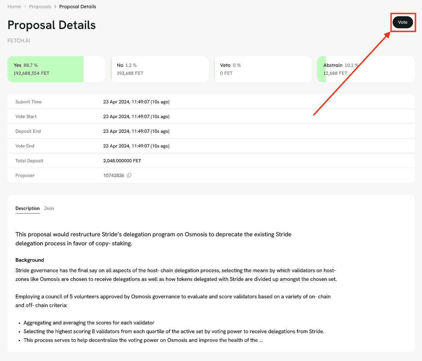 Whenever you wish to participate in a Governance Proposals voting, you will need to open the related Proposal’s details page by clicking on the Proposal itself within the Proposals page in the Agent Network Hub. Once you open the proposal’s details page, if the proposal voting period hasn’t still ended, then you should be able to see a Vote button at the top of the page: