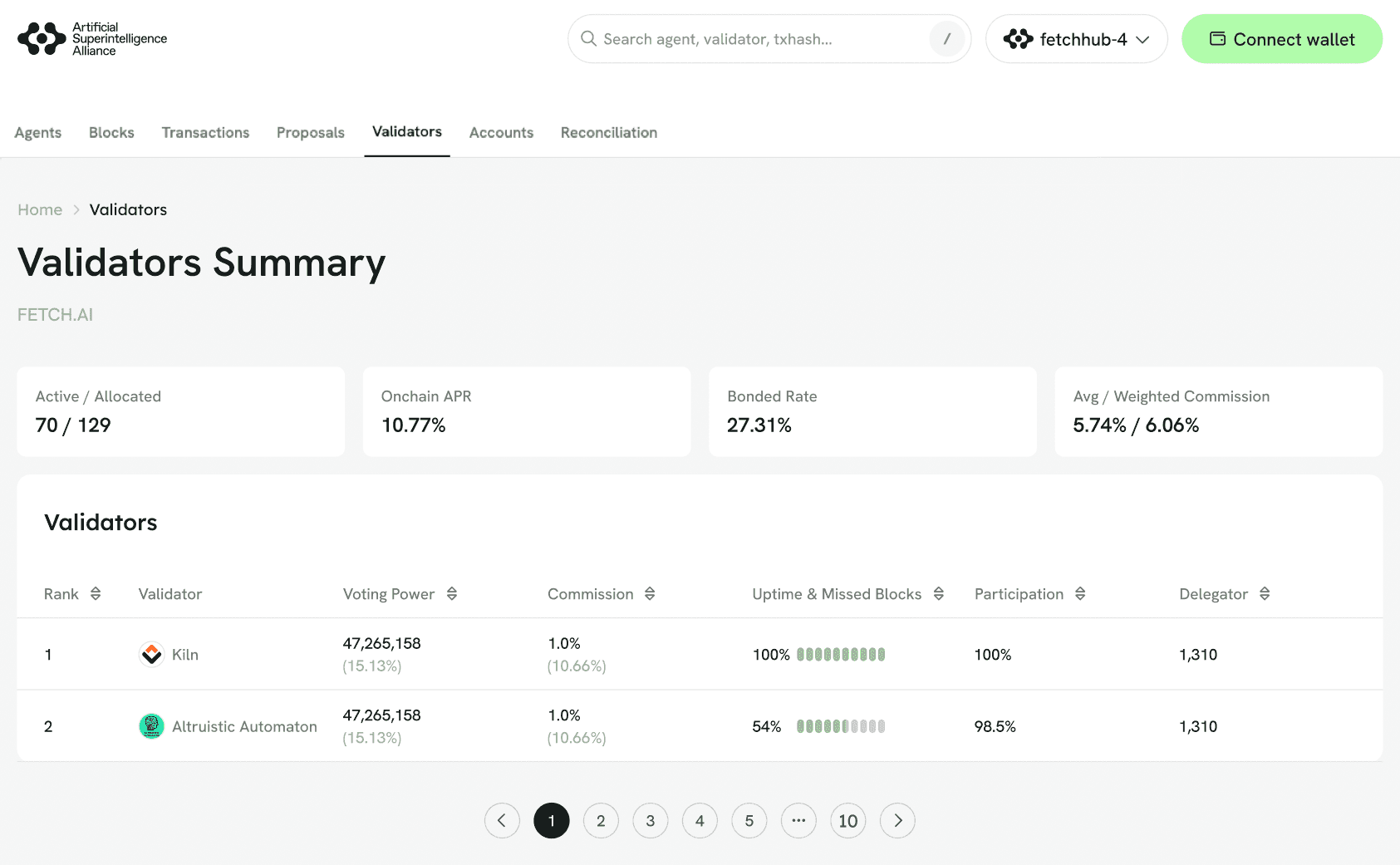 The Validators page of the Agent Network Hub UI provides an overview of the blockchain’s validators, helping users analyze their performance, participation, and overall contribution to network security. It is particularly useful for delegators, network participants, and developers who want to track validators’ statistics.