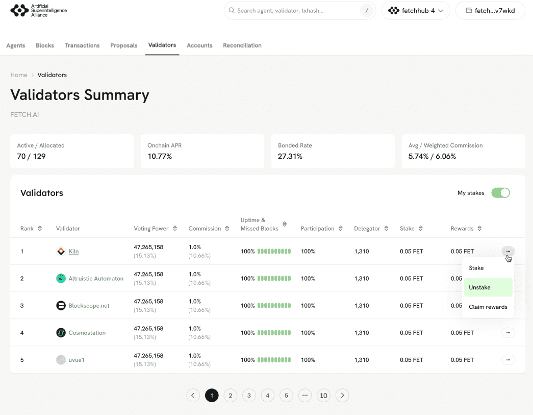 Once you connect your ASI Wallet to the Agent Network Hub UI, you will be able to see the refreshed table for Validators based on your Stakes amount: