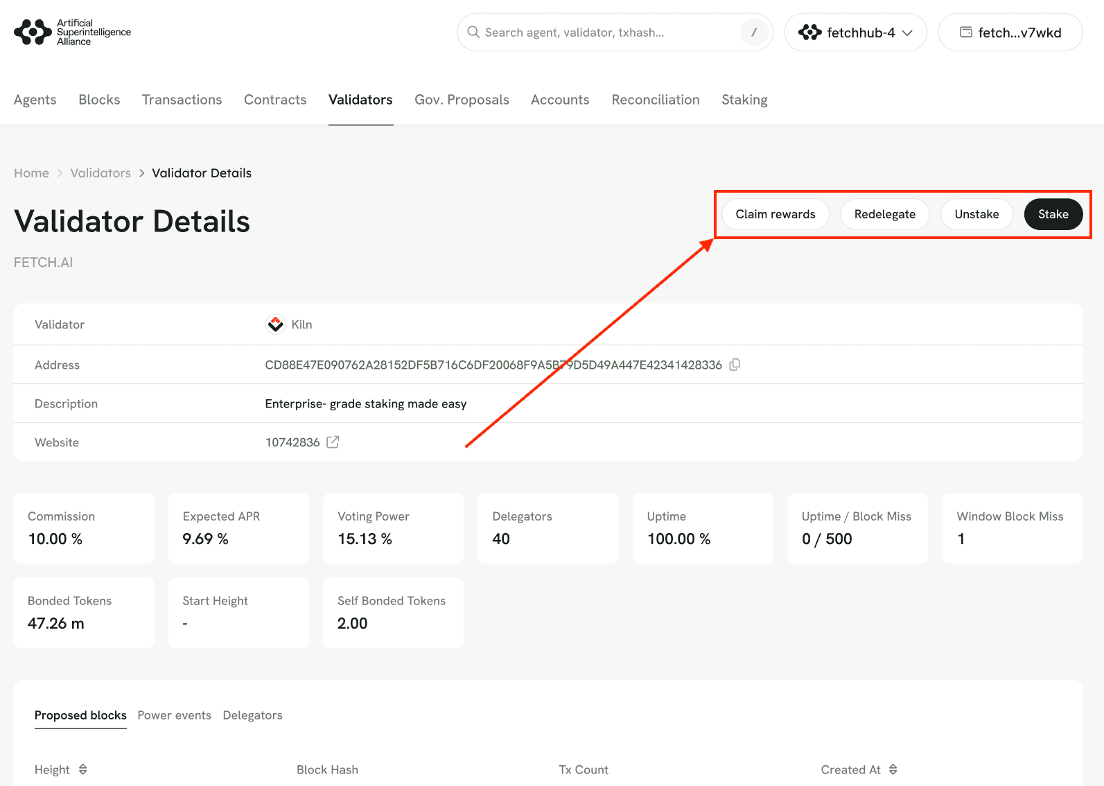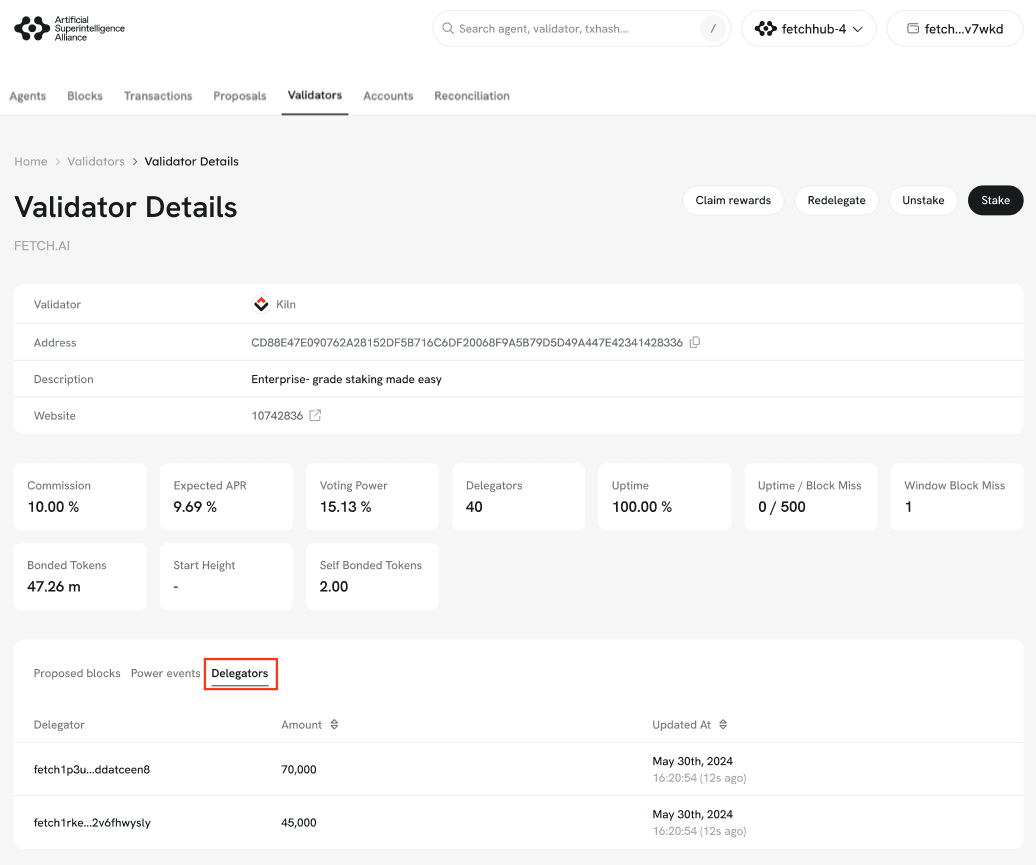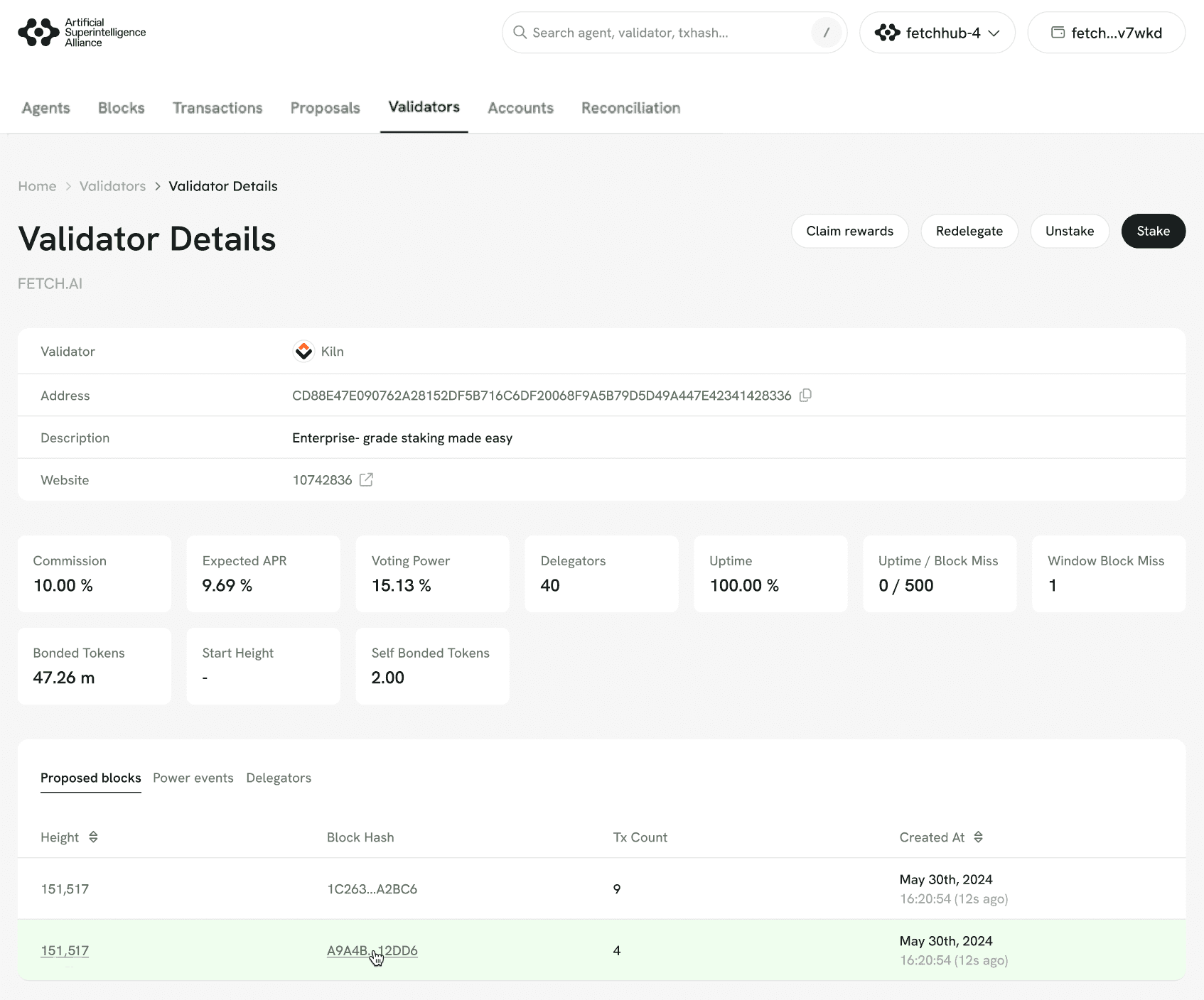 Within each specific validator’s details page, users have the options to manage rewards as well as staked/delegated tokens to that particular validator. They can do this by clicking on the dedicated buttons: Claim rewards, Redelegate, Unstake and Stake.