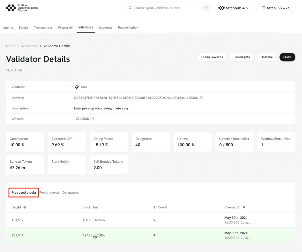 Within the Proposed Blocks tab available at the bottom of the validator’s Details page, users are able to see a list of blocks that this validator has proposed as part of its role in the network. Here, you can explore the following information: