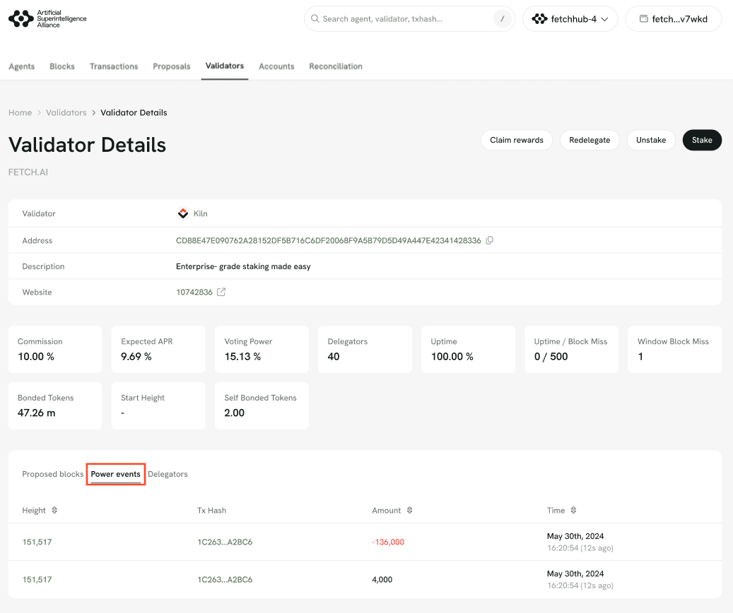 The Power Events tab provides a historical record of events that have impacted the validator’s voting power. Users can check the following information within this tab: