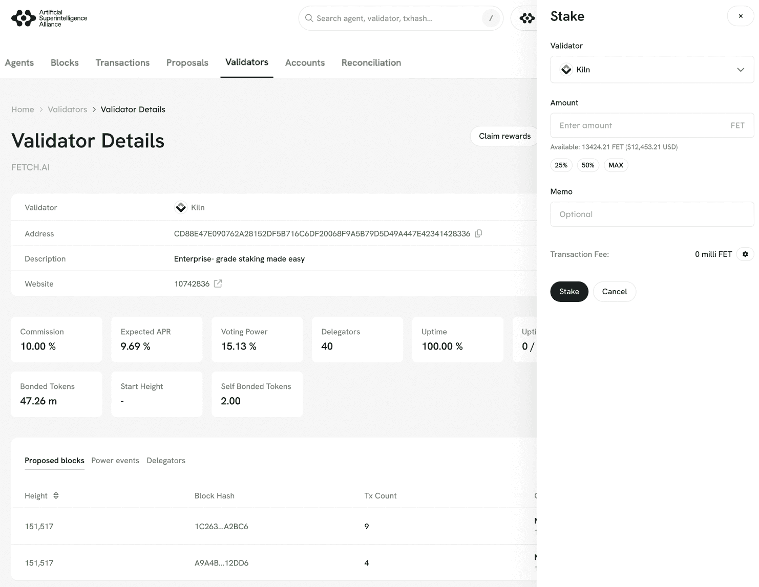 This way, you can directly stake FET tokens with the validator of your choice. You will need to provide the Amount of tokens you wish to stake as well as the name of the Validator you want to stake your tokens with. You can also add a memo field for information you wish to add to the transaction. Once you are satisfied, click on the Stake button. You will see a summary showing up for the operation. Then, click on Confirm and Approve the transaction within your ASI Wallet.