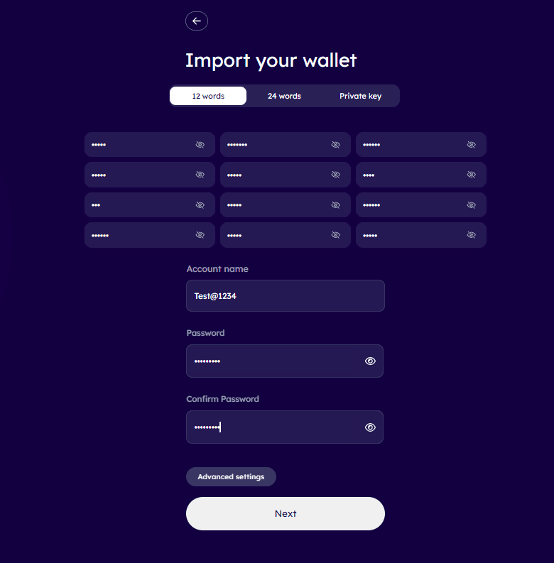 - Mnemonic Seed or Private Key: The user can choose to import their account by pasting the mnemonic seed (12 or 24 words) or the private key.