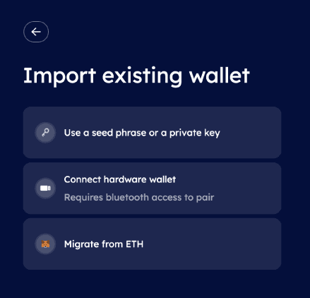By choosing this option, you will need to choose among 3 different option to import an existing wallet.