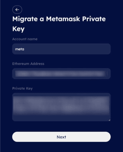 - You will be taken to the main import screen, where you can provide the Account Name, the Ethereum Address you are migrating from (i.e., in this case, your Metamask ETH address). This is used to ensure that the private key matches. Finally, copy the Private Key from your Metamask account.