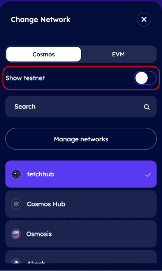 - User can use the Show testnet switch to show or hide testnets.
