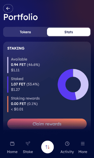On the other hand, the Stats tab displays the staking information, including Available tokens for staking, Staked tokens and Staking rewards accrued.