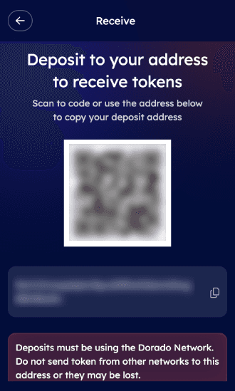 User is redirected to the Receive page, where their QR Code and wallet address can be accessed.