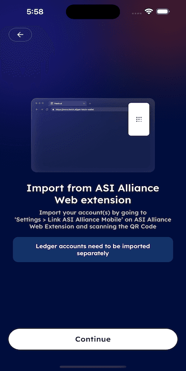 - Whenever a user accesses the mobile app and already has an account created on the web extension, they can utilise the Import from ASI Alliance extension function to access all their extension accounts on their phone.