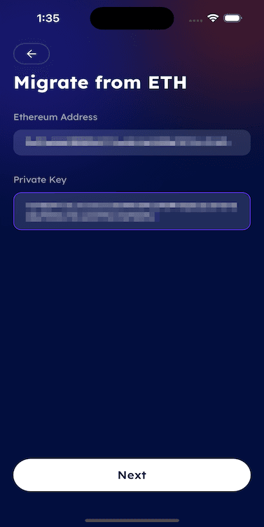 - After that, You will then be taken to the main import screen, where you can name the key, specify the ETH address you are migrating from, which in this case is your Meta mask ETH address (this is used to ensure that the private key matches), and finally copy the private key from your Meta mask account.