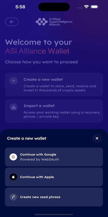 Launch the ASI Alliance Wallet app, and you will see 2 options: