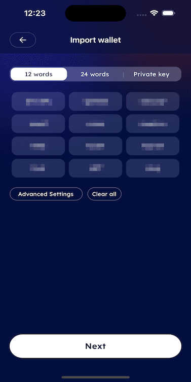 - Using Mnemonic Seed or Private Key. The user can choose to import their account by pasting the mnemonic seed (12 or 24 words) or the private key.