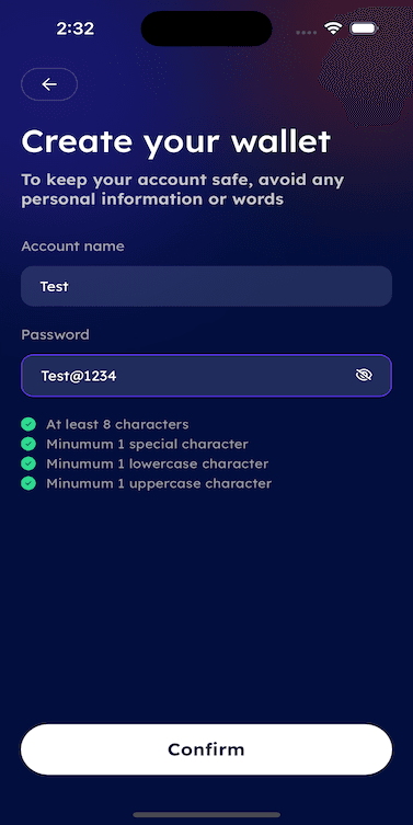 - Set a password for your account and give it a name. The next time you wish to use the wallet or make significant changes to your account, this password will be required. Click here for More Details