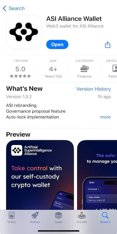 - Install the ASI Alliance Wallet app on your device. This wallet is compatible with all Android and iOS versions. You can find it by searching for ASI Alliance Wallet on the Google Play Store or the App Store, or by using the following link: